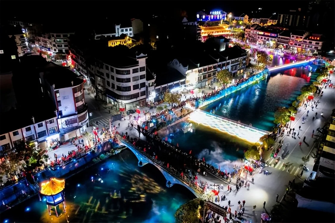 4、九资河镇鸠兹古邑:文旅休闲街区沉浸式演出和光影秀夜景,和以京剧鼻祖余三胜为主题的中国京剧小镇风情;